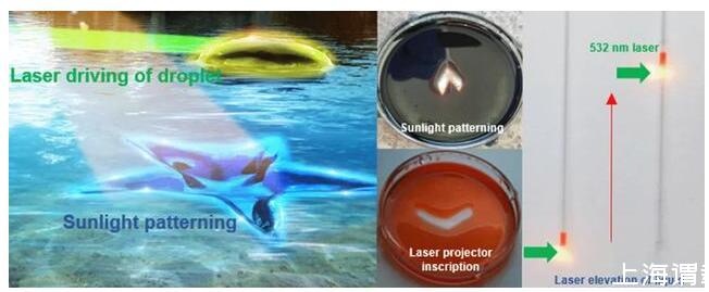 研究中,王志明團隊也展示了一些基本應(yīng)用示例,比如借助激光和日光可以在液體表面雕刻圖形,還可讓激光搬運液體,讓激光驅(qū)動毛細管中的液體,讓激光驅(qū)動液體表面液滴、甚至驅(qū)動不同液滴發(fā)生化學(xué)反應(yīng)的應(yīng)用。