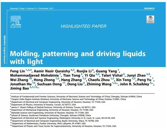 該論文以電子科技大學(xué)第一單位發(fā)表在國際頂級期刊Materials Today上,并被期刊主編選為Highlighted paper作為亮點工作報道,論文題為《光驅(qū)動液體塑模、繪畫和運動》(Molding,patterning and driving liquids with light)[1]。
