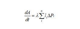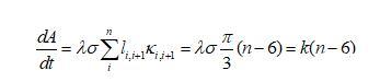下面我們推導(dǎo)二維泡沫的演變方程,由于任一氣泡跟周圍氣泡的氣體交換都是通過氣泡邊界進行的,則氣泡體積(二維氣泡用面積表示)隨時間的變化率跟邊界長度和邊界上的壓強差都有關(guān)系,可以表示為
