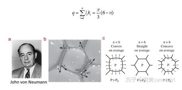 比如,依據(jù)Plateau第一定律,可以推出,相鄰三個相互接觸的氣泡的三條邊界上的曲率之和為零(Curvature sum rule)。其中最重要地是1952年von Neumann利用它推導(dǎo)出了二維泡沫的演變方程(Ref 3)。