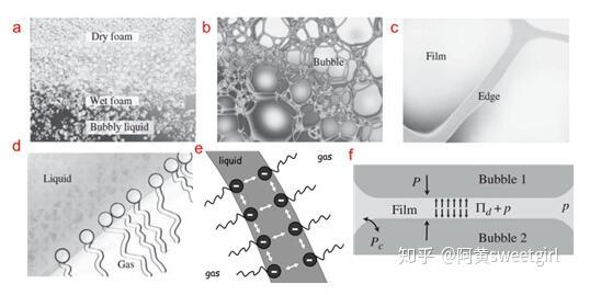 圖1.不同尺度下的泡沫結(jié)構(gòu)及穩(wěn)定機制(Ref 1)(a)整個泡沫結(jié)構(gòu),尺度為0.01 m至1 m。(b)干泡沫的放大部分,尺度為0.1 mm至1 cm。(c)液體通道,也叫Plateau邊界,尺度為1 um至0.1 mm以及肥皂泡膜,尺度為10 nm到1 um。(d)氣液界面的分子層結(jié)構(gòu),尺度為0.1 nm到10 nm。e-f)氣泡膜在界面靜電力排斥作用即楔裂壓(disjoining pressure)的作用下而穩(wěn)定存在。