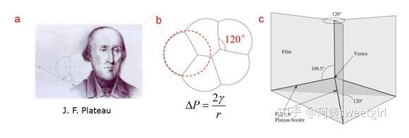 泡沫物理學(xué)集中于研究泡沫的結(jié)構(gòu)、靜力學(xué)、動態(tài)演變及排液等內(nèi)容。它是一個十分古老的學(xué)科,由比利時物理學(xué)家Plateau在19世紀(jì)中葉開創(chuàng)(圖2a)。Plateau在數(shù)十年的失明的時光里,依舊通過指導(dǎo)他侄子做試驗,堅持研究肥皂泡薄膜的幾何形態(tài)及其背后隱藏的力學(xué)規(guī)律。1873年,他和侄子把自己的實驗現(xiàn)象和分析結(jié)果做了系統(tǒng)整理,以法文發(fā)表,從此把對泡沫結(jié)構(gòu)的研究由定性印象推到了量化階段,開創(chuàng)了泡沫物理學(xué)(Ref 2)。在泡沫靜力學(xué)方面,Plateau的主要貢獻在于其提出了干泡沫的靜態(tài)結(jié)構(gòu)力學(xué)的三定律,它是后續(xù)泡沫研究的基石: