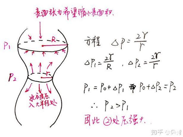 表面張力會(huì)像皮筋一樣收縮液體的表面積,同時(shí)壓力大(半徑小)的地方的水被擠到半徑大的地方,使得本來(lái)細(xì)的地方半徑變得更小。