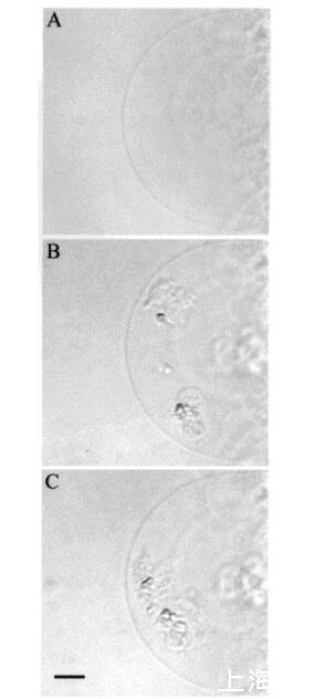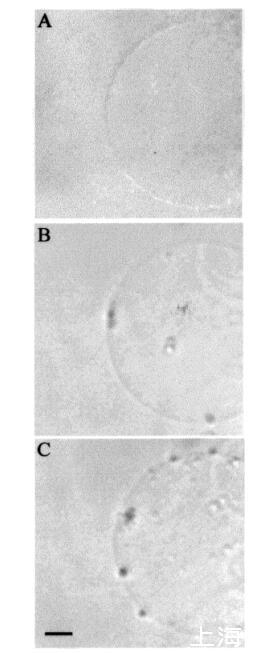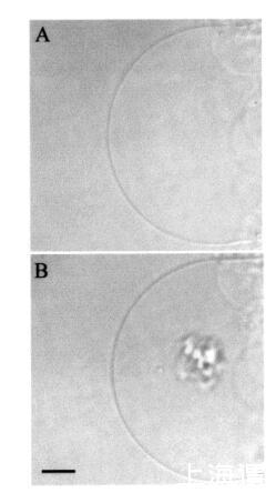 圖9:HMC圖像序列,說明了在添加肽之前(圖a)和應(yīng)用肽后立即通過temporin L.巨大囊泡轉(zhuǎn)化SOPC/膽固醇(Xchol)0.10)巨大脂質(zhì)體≈0.24 fmol的temporin L(面板B)。面板B中比例尺的長度對應(yīng)于50μm。