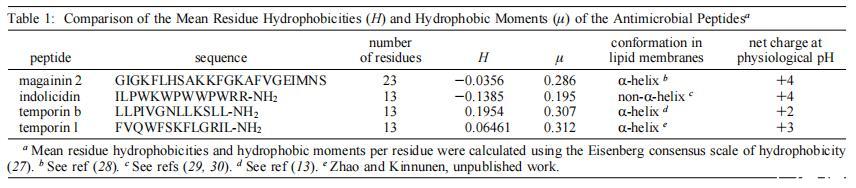 我們的長期目標(biāo)是建立最低的序列要求,這可以進一步作為設(shè)計新型抗菌肽類似物的指導(dǎo)原則。我們之前已經(jīng)比較了兩種抗菌肽,馬蓋寧2和吲哚肽對本研究中使用的相同模型膜系統(tǒng)的影響,即。,單層、脂質(zhì)體和巨大囊泡(15)。我們早期研究中使用的肽是選擇的,因為它們代表兩種不同類型的抗菌肽家族。在本研究中,我們使用了兩種13個氨基酸的肽,即與吲哚肽長度相似的肽。肽的結(jié)構(gòu)參數(shù)不同,如電荷、構(gòu)象、疏水性、疏水力矩和大?。ū?)。有趣的是,在所研究的四種肽中,以摩爾為基礎(chǔ)計算的時間蛋白L最有效,作用于中性和酸性磷脂膜。與其他三種肽相比,其凈陽離子電荷和疏水性具有平均值(表1)。然而,在所示的肽中,temporin L具有最高的平均疏水力矩,這表明這可能是與其有效的膜擾動作用相關(guān)的一個重要參數(shù),這與之前比較magainin 2和其他抗菌肽的研究一致(31)。