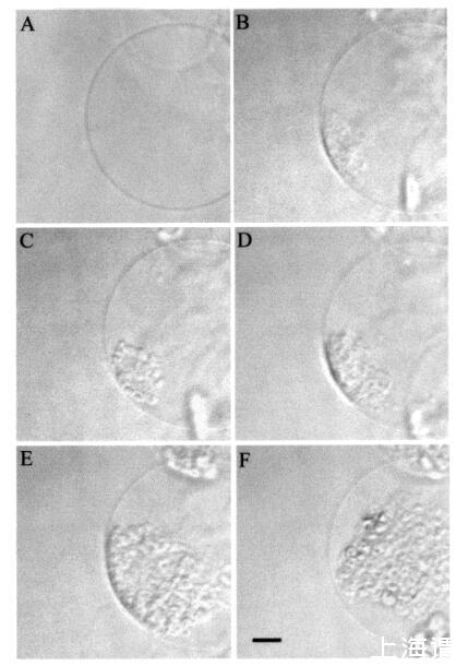 然后我們研究了顳葉素L對巨大脂質(zhì)體的影響。圖7所示的圖像序列說明了由于temporin L引起的SOPC巨大脂質(zhì)體的轉(zhuǎn)化。有趣的是,大約12 amol temporin L(1次注射)已經(jīng)影響了SOPC膜的外觀,在添加肽后1秒內(nèi),巨大囊泡內(nèi)出現(xiàn)聚集結(jié)構(gòu)(圖7,面板B)。此外,相鄰的巨大囊泡也受到類似囊泡形成的影響(圖7,面板B,研究的巨大脂質(zhì)體下方)。進一步添加temporin L(最多≈0.12 fmol,共10次重復(fù)注射)不會誘導(dǎo)進一步的囊泡形成,而兩個“內(nèi)吞”聚集體粘附在肽微注射部位的巨大脂質(zhì)體表面。大約5分鐘后,這兩個“內(nèi)吞”聚集體粘附在一起,在巨大囊泡內(nèi)形成一個更大的聚集體結(jié)構(gòu)(圖7,面板C)。與顳葉素L對SOPC巨脂質(zhì)體的作用類似,該肽在POPG(XPOPG)0.10存在下誘導(dǎo)類內(nèi)吞過程,圖8)。更具體地說,在添加約12 amol的temporin L(1次注射)后,暴露于肽的巨大脂質(zhì)體表面的區(qū)域變暗,顯示折射率的顯著變化,并指示形成緊密堆積的三維結(jié)構(gòu),僅部分保留在焦平面中(圖8,面板B)。在內(nèi)部≈1秒后,巨大脂質(zhì)體內(nèi)出現(xiàn)了小顆粒聚集體和暗區(qū)(圖8,面板C)。同時,還觀察到相鄰巨大囊泡中的囊泡形成(圖8,圖B和圖C)。隨后總共增加了≈24阿米爾的顳葉素L(2次注射)使另一組“內(nèi)吞”小顆粒出現(xiàn)在巨大脂質(zhì)體內(nèi),與先前形成的聚集體粘附(圖8,面板D)。之后≈1分鐘,其中一些顆粒(φ≈8μm)從巨大脂質(zhì)體內(nèi)的雙層釋放(數(shù)據(jù)未顯示)。有趣的是,在進一步添加約12 amol的Temporain L(總共3次注射)后,分離的小顆粒再次聚集,暗區(qū)的面積增加(圖8,面板E)。暗區(qū)面積的增加通過添加另一個≈24 amol temporin L(共5次注射)。幾分鐘后,聚集的“內(nèi)吞”小顆粒進入巨大囊泡的內(nèi)腔,而膜表面的暗區(qū)消失(圖8,面板F)。同時觀察到相鄰的巨大脂質(zhì)體的囊泡形成。有趣的是,在膽固醇(Xchol)為0.10的情況下,需要更多的時間蛋白L來誘導(dǎo)囊泡形成(圖9)。然而,在添加約0.24 fmol(20次注射)的Tempolin L后,小顆粒的“內(nèi)吞”聚集物以及≈巨大脂質(zhì)體內(nèi)出現(xiàn)直徑為9μm的顆粒(圖9,面板B)。隨后添加≈0.24 fmol的肽(共40次注射)在巨大囊泡內(nèi)誘導(dǎo)另一組小顆粒,約30秒后與第一個聚集物合并(數(shù)據(jù)未顯示)。然而,隨后進一步添加temporin L(高達約1.2 fmol,100次注射)對巨大脂質(zhì)體膜沒有進一步的可見變化。