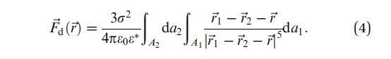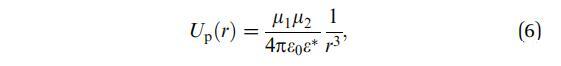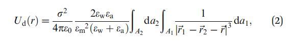 其中Ai表示域i的面積,dai表示其面積元素,-ri表示其相對于域中心的位置向量,i=1,2-r是從域1中心到域2中心的向量,如圖1所示。e0是真空介電常數(shù),ew和ea分別是水和空氣的相對介電常數(shù)。在這里,我們使用了Urbakh等人21的研究結(jié)果,該研究描述了由兩個半無限介質(zhì)包圍的薄電介質(zhì)層中偶極子之間的相互作用。