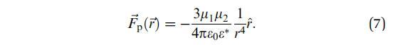 正如預(yù)期的那樣,對于較大距離,它減少到兩點偶極子r 4的力。這些表達(dá)式不描述實驗相關(guān)區(qū)間(2+0.1)R 10R內(nèi)的域之間的相互作用,因此必須對等式(4)進(jìn)行數(shù)值積分。與解析表達(dá)式相比,該4D積分在模擬中代表了更多的計算工作量。這就是為什么更容易近似磁疇中心點偶極子的相互作用,偶極矩mi表示磁疇區(qū)域上的偶極密度,mi=sAi。然后,垂直于界面的點偶極子的對電勢為