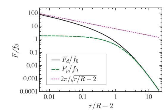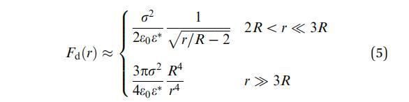圖2顯示了兩個半徑相等的圓形區(qū)域的Fd(r)(實線)和Fp(r)(虛線)。疊加在等式(4)的數(shù)值解上,我們添加了等式(5)(虛線)的短距離的漸近表達(dá)式。注意,當(dāng)兩個域接近接觸(r=2R)時,F(xiàn)d發(fā)散,而Fp保持有限。此外,對于實驗感興趣的范圍2R o r o 10R,兩個力之間的差異是可觀的。特別是,即使r=5R,差值也在15%左右。