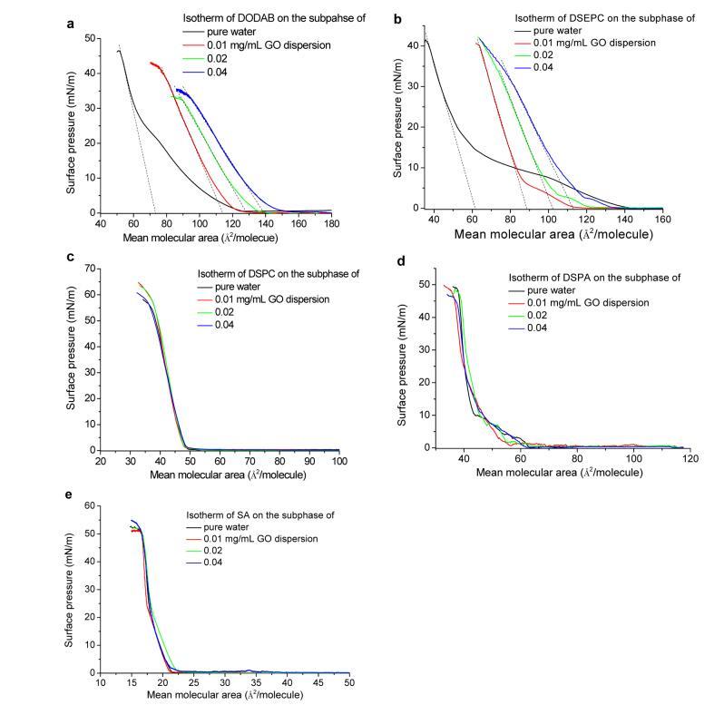 圖1顯示了表面壓力?純水和GO水分散體亞相(0.01、0.02和0.04 mg/mL GO)上帶正電的DODAB(a)和DSEPC(b)、帶中性電荷的DSPC(c)、帶負電的DSPA(d)和SA(e)的面積等溫線。