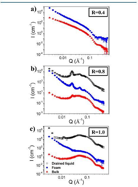 圖2:對于(a)R=0.4,(b)R=1.0和(c)R=2.0,散裝溶液(紅色三角形)、泡沫(藍色圓圈)和排出液體(黑色空圓圈)的SANS光譜。為清晰起見,將光譜強度相互偏移了100倍。