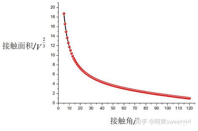 上圖是接觸角從5°到120°范圍內的接觸面積的變化關系,基本上涵蓋了自然界中的大多數物質的光滑固體表面。