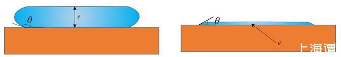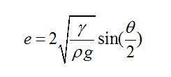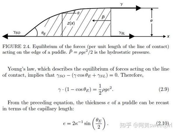 有意思的是,已經有前人對這種情形做過詳細的受力分析。得出只要接觸角一定,此時無論加多少水,液體的厚度e都不會增加,只會增加鋪展的面積。其厚度e的表達式為:
