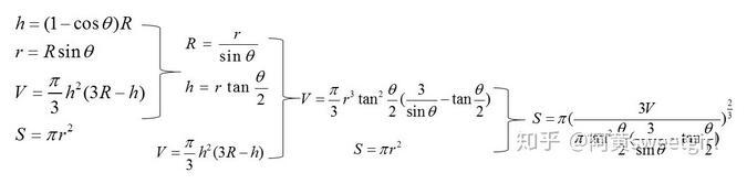 此時根據球的體積公式,以及簡單的三角函數變換,就可以得出S與V和θ的關系,具體推導過程如圖2所示。
