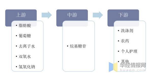 從產(chǎn)業(yè)鏈來看,烷基糖苷產(chǎn)業(yè)鏈由上游原材料、中游生產(chǎn)制造、下游應(yīng)用領(lǐng)域三部分構(gòu)成。產(chǎn)業(yè)鏈上游原材料主要包括脂肪酸、葡萄糖、去離子水、雙氧水、氫氧化鈉;產(chǎn)業(yè)鏈下游主要應(yīng)用于洗滌劑、個護、農(nóng)藥等領(lǐng)域。