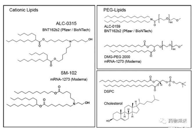 兩款mRNA疫苗采用的脂質(zhì)納米粒組成非常相似。都含有可電離的脂質(zhì),該脂質(zhì)在低pH值時帶正電利于與mRNA靜電作用絡(luò)合,在生理pH值時呈中性促進mRNA的遞送和釋放并減少潛在的毒性。都含有聚乙二醇化脂質(zhì),以減少血清蛋白的抗體結(jié)合和吞噬細(xì)胞的清除,從而延長全身循環(huán)時間。磷脂二硬脂酰磷脂酰膽堿(DSPC)和膽固醇形成穩(wěn)定結(jié)構(gòu)有助于包載mRNA。兩款疫苗的可電離陽離子脂質(zhì):PEG-脂質(zhì):膽固醇:DSPC的摩爾比分別為46.3:1.6:42.7:9.4(Pfizer/BioNTech)和50:1.5:38.5:10(Moderna)。脂質(zhì)納米粒的粒徑為80~100nm,每個脂質(zhì)納米粒中包含有約100個mRNA分子。