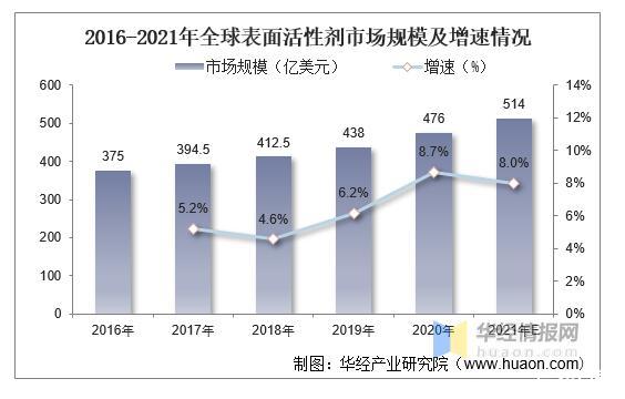 雖然近年來國際原油價格震蕩全球經濟形式的不確定性增加對全球表面活性劑產業造成一定程度的沖擊,但以洗滌用品、食品加工等為主要下游應用領域的表面活性劑產品剛性需求特征明顯,行業規模仍保持增長態勢。據資料顯示,2020年全球表面活性劑行業市場規模為476億美元,同比增長8.7%。