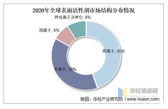 從市場結構來看,2020年全球表面活性劑市場中,陰離子和非離子是其最主要的細分領域,占比分別為45%和39%,陽離子和兩性離子及其它占比分別為8%和9%。