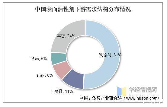 從行業下游應用結構來看,洗滌劑行業是我國表面活性劑產業最大的下游應用領域,需求占比超50%。具體來看,我國表面活性劑下游需求市場中,洗滌劑行業占比為51%,化妝品行業占比為11%,紡織行業占比為8%,食品行業占比為6%。