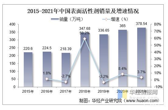 從銷量情況來看,隨著下游需求的不斷增長,我國表面活性劑銷量也隨之不斷增長。據資料顯示,2021年我國表面活性劑銷量為378.54萬噸,同比增長3.7%。