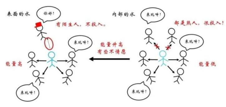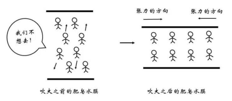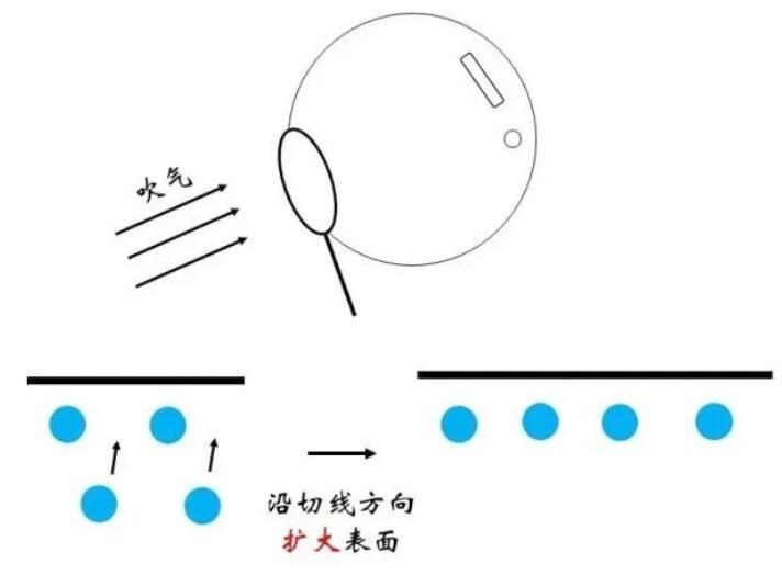 俗話說“物以類聚,人以群分”,更加相似的同類分子間往往關(guān)系更為融洽,而不同種分子間的關(guān)系則相對疏遠(yuǎn)。在物理上表現(xiàn)為同類分子間的勢能曲線最低點更低。因此,對于一個存在于內(nèi)部的水分子,如果來到表面,需要斷開與同類分子的部分關(guān)系,而代之以與比較“生疏”的空氣分子間的作用,顯然是不情愿的!這體現(xiàn)為能量的升高。那么,什么情況下水分子要從內(nèi)部來到表面呢?正是吹泡泡的時候。