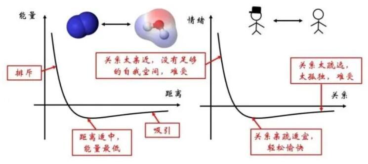 在微觀世界存在著多種多樣的分子,比如上圖所示的氮氣與水分子。分子間組成的體系的勢能與分子間的距離有關(guān)。這種關(guān)系正如兩個人之間的關(guān)系,遠(yuǎn)了近了都不好。如果距離太近,彼此之間沒了自我空間,情緒會不穩(wěn)定,因此會產(chǎn)生相互排斥的作用;如果距離太遠(yuǎn),每個人都太孤獨,便會相互思念,彼此吸引。當(dāng)彼此的距離恰到好處,便對應(yīng)著能量的最低點,較為穩(wěn)定。