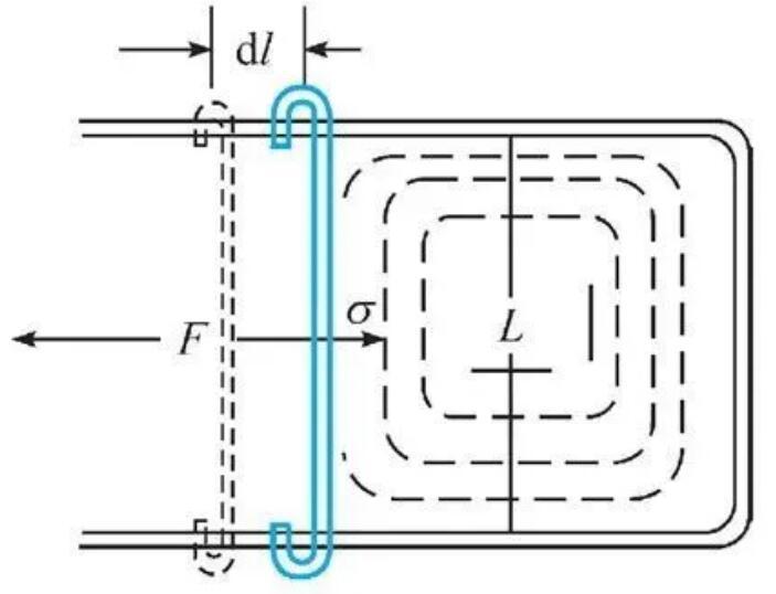 我們曾經(jīng)提到比表面能的單位是J/m,而將這個物理量從力的角度去理解對于處理一些問題更加直觀,我們常常將比表面能稱為表面張力。而J/m=N/m,并不是力的單位N,因此表面張力代表的是作用在單位長度的表面上的力。在下圖所示的實驗中,肥皂水膜在力F的牽拉下長大,表面張力便是