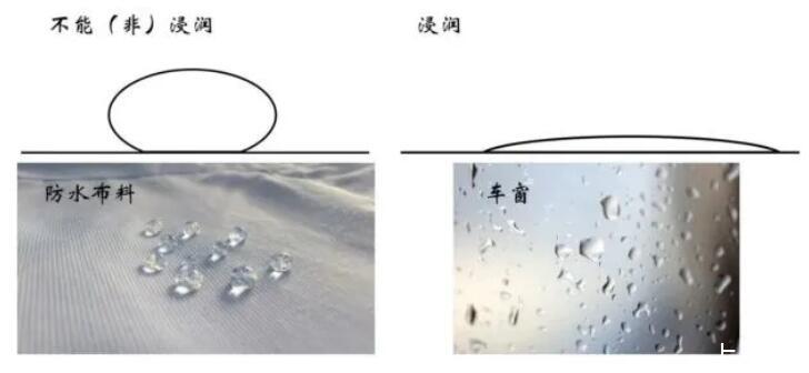 浸潤現(xiàn)象,這個詞可能大家比較陌生,但是對應(yīng)的物理現(xiàn)象非常常見。比如下圖所示的防水衣服以及公交車車窗上的水滴就是非浸潤和浸潤代表性的場景。
