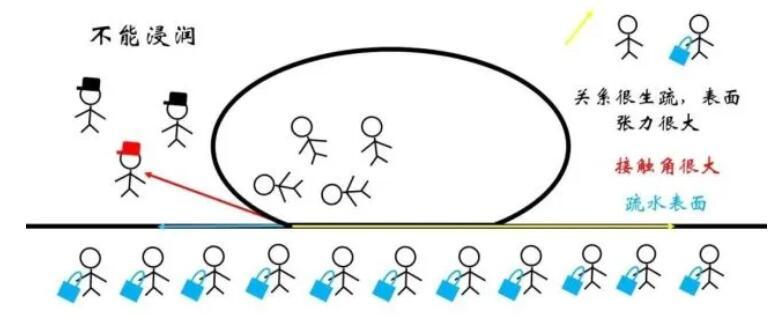 進(jìn)一步地,就涉及到一個問題:不同物質(zhì)的表面張力的大小與什么有關(guān)呢?在定性上,我們可以引入稱為親和度的概念,它反映了界面兩側(cè)物質(zhì)親疏關(guān)系。如果兩側(cè)的物質(zhì)很親和,那么待在內(nèi)部和表面其實區(qū)別不大,畢竟大家都合得來,因此表面張力相對較小。反之,如果兩側(cè)的物質(zhì)關(guān)系很疏遠(yuǎn),表面張力會很大。而這,正是浸潤現(xiàn)象產(chǎn)生的根源。