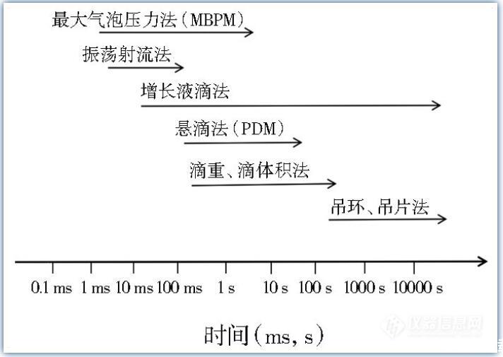 由于對(duì)DST時(shí)間范圍界定的不同,可運(yùn)用的測(cè)量手段也有所不同。王建坤等認(rèn)為,在達(dá)到靜態(tài)表面張力前的表面張力變化都可算是DST,這個(gè)時(shí)間范圍以幾毫秒到幾小時(shí)計(jì)。可用Wilhelmy吊片法、DuNouy吊環(huán)法、滴重法、滴體積法、懸滴法、最大氣泡壓力法測(cè)定DST。