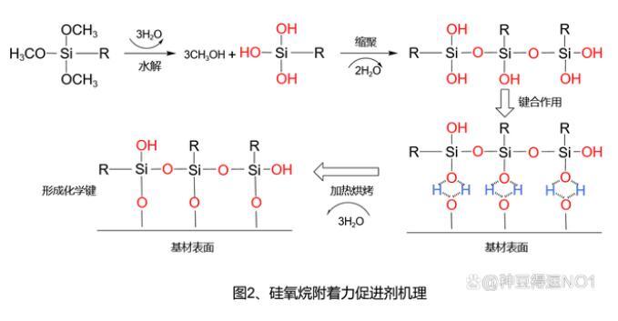 對于陶瓷、玻璃、塑料、金屬等基材,通過化學(xué)鍵合的作用能很好的促進涂層與基材之間的附著力,有機硅烷通過水解,形成的硅羥基能與基材表面的羥基,通過鍵合作用能很好的形成牢固的吸附層,同時R中的活性基團可以與樹脂中的基團形成交聯(lián)反應(yīng),從而在樹脂與基材之間形成架橋的作用。