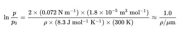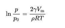 化學熱力學化學動力學方面就不說了,說一個不太一樣的。為什么潑在地上的水很快就干了,而洗完的衣服卻不容易晾干?并不是由于比表面積不同,衣服就只是一層布料,比表面積同樣很大。而是因為液滴的蒸氣壓與它表面的曲率半徑有關(guān)。這一關(guān)系由開爾文方程描述: