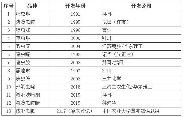 目前,在全球范圍內開發或已使用的新煙堿類農藥主要有13種,詳細信息見表1。
