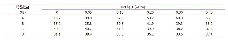 表3.含有不同濃度NaCl的抑塵劑與煤塵NR的潤濕性能