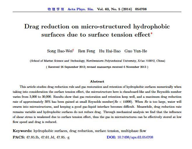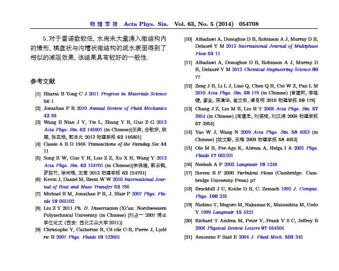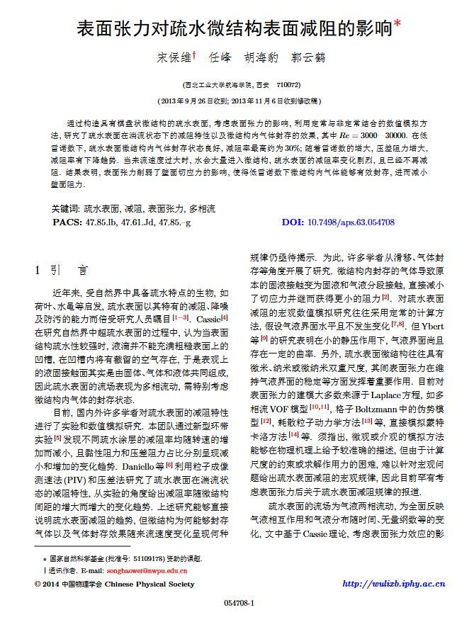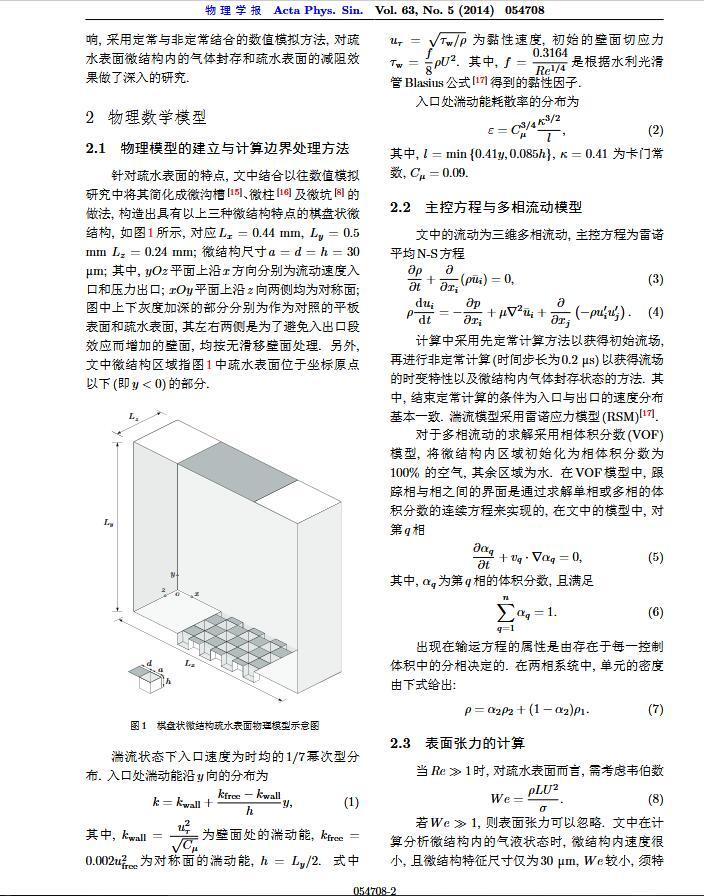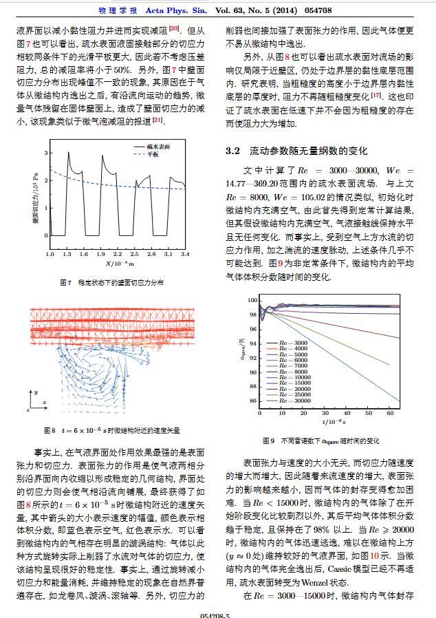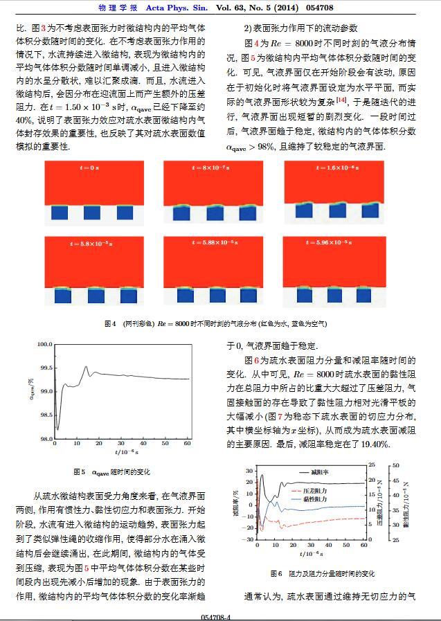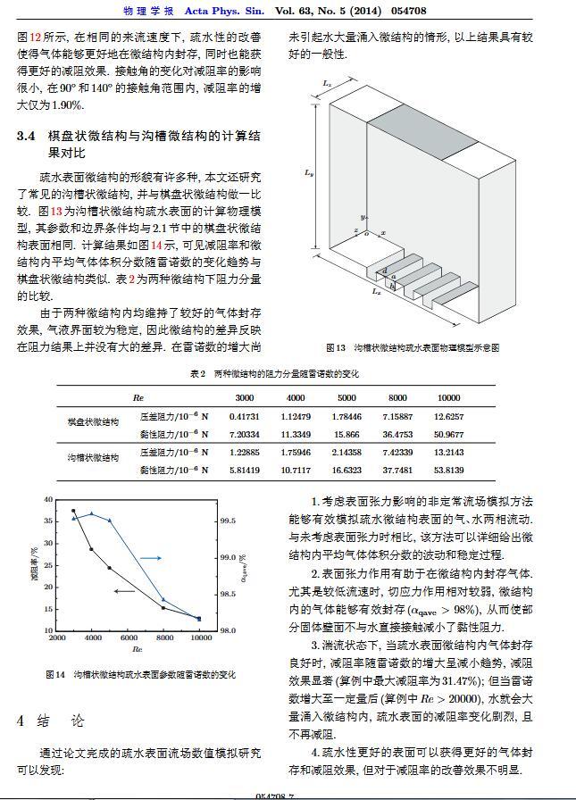 通過構造具有棋盤狀微結構的疏水表面,考慮表面張力的影響,利用定常與非定常結合的數值模擬方法,研究了疏水表面在湍流狀態下的減阻特性以及微結構內氣體封存的效果,其中Re=3000—30000.在低雷諾數下,疏水表面微結構內氣體封存狀態良好,減阻率最高約為30%;隨著雷諾數的增大,壓差阻力增大,減阻率有下降趨勢.當來流速度過大時,水會大量進入微結構,疏水表面的減阻率變化劇烈,且已經不再減阻.結果表明,表面張力削弱了壁面切應力的影響,使得低雷諾數下微結構內氣體能夠有效封存,進而減小壁面阻力.