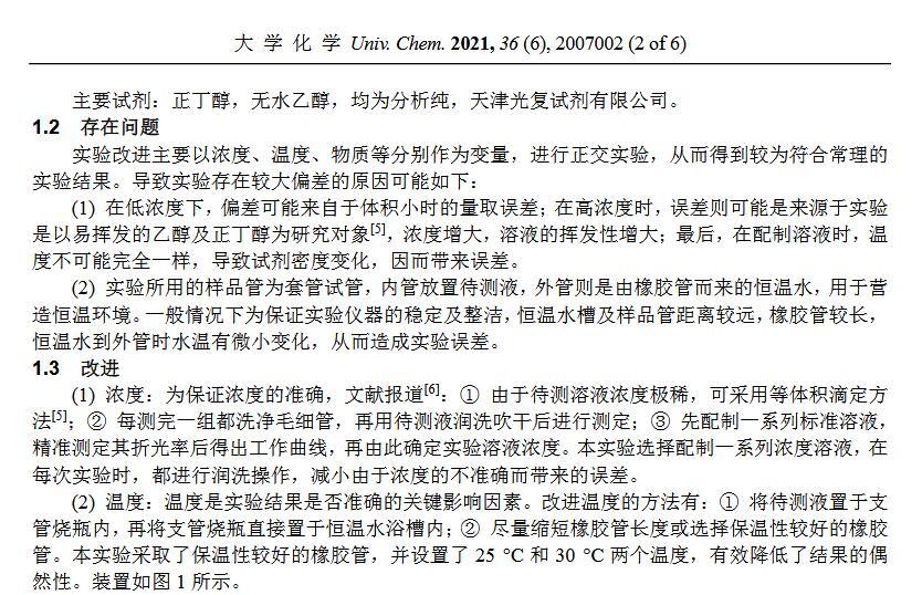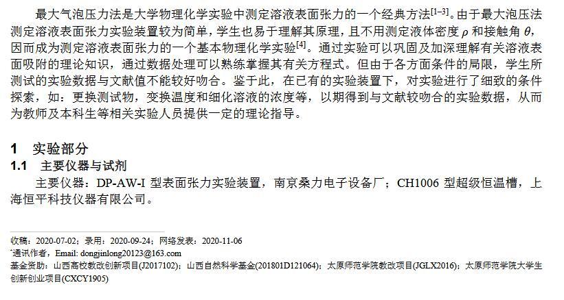 【摘要】:最大氣泡壓力法測(cè)定溶液表面張力是物理化學(xué)實(shí)驗(yàn)中的一個(gè)傳統(tǒng)實(shí)驗(yàn),由于各種因素的影響,導(dǎo)致學(xué)生實(shí)驗(yàn)結(jié)果存在較大偏差。本研究通過濃度、溫度等作為變量進(jìn)行實(shí)驗(yàn)條件探索而得到的結(jié)果與文獻(xiàn)值較為吻合。