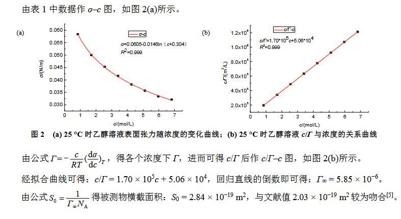 最大氣泡壓力法是大學(xué)物理化學(xué)實(shí)驗(yàn)中測(cè)定溶液表面張力的一個(gè)經(jīng)典方法[1–3]。由于最大泡壓法測(cè)定溶液表面張力實(shí)驗(yàn)裝置較為簡(jiǎn)單,學(xué)生也易于理解其原理,且不用測(cè)定液體密度ρ和接觸角θ,因而成為測(cè)定溶液表面張力的一個(gè)基本物理化學(xué)實(shí)驗(yàn)[4]。通過實(shí)驗(yàn)可以鞏固及加深理解有關(guān)溶液表面吸附的理論知識(shí),通過數(shù)據(jù)處理可以熟練掌握其有關(guān)方程式。但由于各方面條件的局限,學(xué)生所測(cè)試的實(shí)驗(yàn)數(shù)據(jù)與文獻(xiàn)值不能較好吻合。鑒于此,在已有的實(shí)驗(yàn)裝置下,對(duì)實(shí)驗(yàn)進(jìn)行了細(xì)致的條件探索,如:更換測(cè)試物,變換溫度和細(xì)化溶液的濃度等,以期得到與文獻(xiàn)較吻合的實(shí)驗(yàn)數(shù)據(jù),從而為教師及本科生等相關(guān)實(shí)驗(yàn)人員提供一定的理論指導(dǎo)。