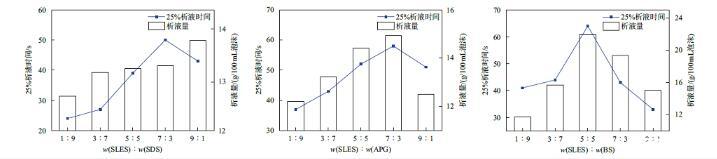 實驗測得SLES,SDS,APG和BS在w=0.2%時的50%消泡時間依次為28.5,45,41和9 min,起泡量依次為800,290,610和700 mL。由圖3可知,對比三組復(fù)配組分的泡沫性質(zhì),SLES/SDS無明顯增效,隨著SLES質(zhì)量分?jǐn)?shù)的增加,復(fù)配組分的起泡量和50%消泡時間接近SLES單組分。SLES/APG的起泡性和泡沫穩(wěn)定性有所提升,其中w(SLES):w(APG)=7:3的復(fù)配組分有較好的泡沫性能,50%消泡時間、起泡量分別為30 min、825 mL。SLES/BS的起泡量減少,但50%消泡時間明顯增加,其中w(SLES):w(BS)=5:5的50%消泡時間、起泡量分別為46.5 min、695 mL。