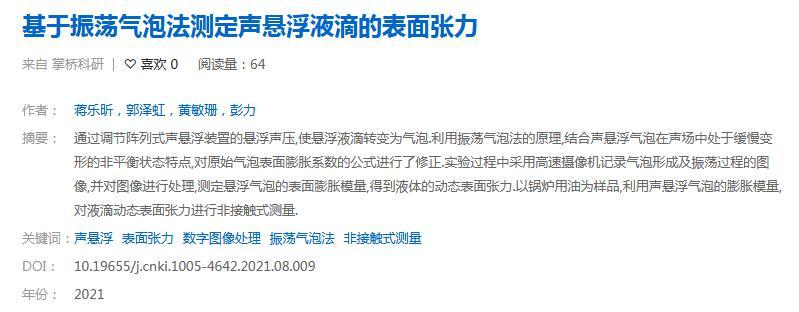 以鍋爐用油為樣品,利用聲懸浮氣泡的膨脹模量,對(duì)液滴動(dòng)態(tài)表面張力進(jìn)行非接觸式測(cè)量。