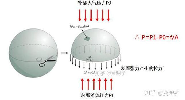 而這里有一件非常關鍵的事請,就是由于表面張力的存在,彎曲的表面就會在兩側形成壓力差。就好像緊繃的氣球,其內部壓力要高于外部的壓力。這種壓力差來自哪里?當然就是氣球皮膜緊繃的張力。由于氣球的彎曲表面,使得其張力最終表現為內部壓力的升高。