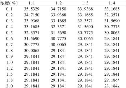 由表1可以明顯看出,同一溫度下,黃花敗醬皂甙的表面張力隨濃度的增大而顯著下降,同一濃度下隨溫度升高,表面張力下降。高溫時(shí)表面張力下降比較明顯,濃度為2.0%時(shí)表面張力不隨溫度變化而變化。cmc約為1%,σcmc約為(25~27)×10-3(N·m-1)。黃花敗醬皂甙符和表面活性劑的定義,濃度變化很小,表面張力下降很大下降到臨界膠束濃度再增加濃度表面張力也不下降。