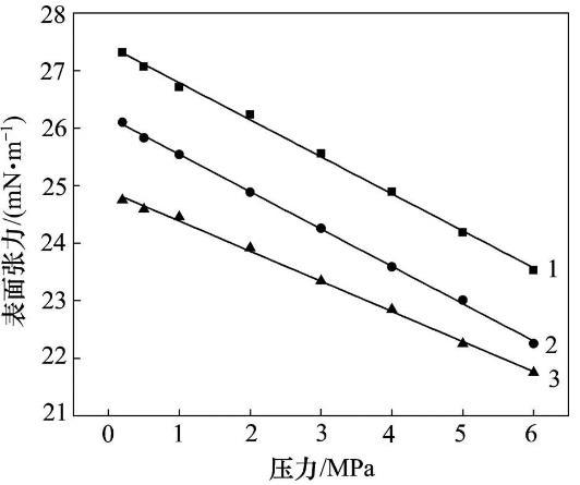 為了研究溫度和壓力對煙道氣?稠油平衡表面張力的影響,分別在80,100和120℃下進行實驗,圖2所示為不同溫度下煙道氣?稠油平衡表面張力隨壓力變化曲線。由圖2可見:當氣體壓力從0.2 MPa升高到6 MPa,在80℃時,煙道氣?稠油表面張力由27.31 mN/m減小到23.53 mN/m,降低了13.84%;在100℃時,煙道氣?稠油表面張力由26.10 mN/m減小到22.26 mN/m,降低了14.71%;在120℃時,煙道氣?稠油表面張力由24.75 mN/m減小到21.75 mN/m,降低了12.12%。當溫度一定時,煙道氣?稠油系統(tǒng)的平衡表面張力隨著壓力的增大而減小,并呈較好的線性關(guān)系。這是因為溫度一定時,壓力增大,煙道氣在稠油中的溶解度增大,使得平衡表面張力減小。當壓力一定時,煙道氣?稠油系統(tǒng)的平衡表面張力隨溫度的升高而減小。這是因為煙道氣的主要成分是N2,N2在稠油中的溶解度隨著溫度升高而增大。