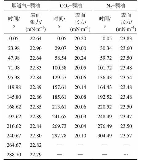 由于煙道氣在原油中具有一定的溶解度,油滴形成后,煙道氣會向原油中擴散、溶解,一直持續(xù)到油滴被煙道氣飽和。為了檢測氣體向原油中溶解、擴散對表面張力的影響,對煙道氣?稠油系統(tǒng)的動態(tài)表面張力進行測定。圖1所示為120℃和4 MPa下測量的煙道氣?稠油動態(tài)表面張力,其中煙道氣組成為80%N2+20%CO2(摩爾分數(shù)),并與CO2?稠油和N2?稠油的表面張力進行對比。由圖1可以看出動態(tài)表面張力的變化可以分為2個階段:第1個階段為波動階段,在氣體擴散的初始階段,動態(tài)表面張力存在一定的波動,約100 s,說明氣體向稠油中擴散會持續(xù)一段時間;第2個階段為平衡階段,氣體?稠油的表面張力波動很小,幾乎是一個常數(shù),在相同的溫度和壓力下,CO2?稠油的表面張力最小,N2?稠油的表面張力最大,煙道氣?稠油的表面張力介于二者之間,表1所示為前300 s稠油與不同氣體作用表面張力的實驗值。