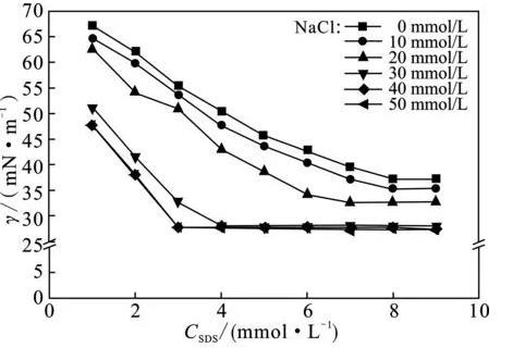 (1)添加無機(jī)鹽,可以降低SDS的cmc值,cmc值隨無機(jī)鹽離子濃度增大而降低,無論何種無機(jī)鹽,cmc值均降至3 mmol/L。