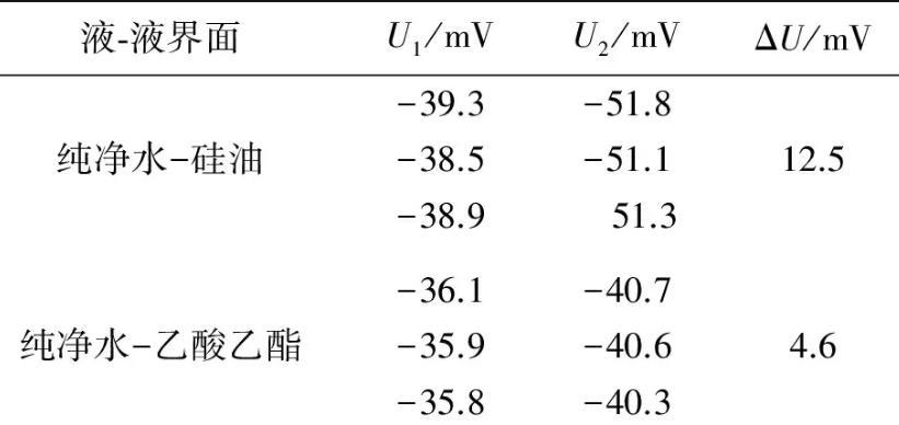 實驗測量所用金屬吊環(huán)的外徑、內徑分別為0.034 96 m和0.033 10 m.在20℃實驗條件下,采用自制2種液體間界面張力的動態(tài)實時測量儀,測量了純凈水-硅油和純凈水-乙酸乙酯間的界面張力.測量出金屬吊環(huán)由液體I中完全進入液體Ⅱ的過程中,液體I的液膜被拉斷前電壓的最大值U1,拉斷后趨于穩(wěn)定時的電壓值為U2,數(shù)據(jù)結果如表1所示。