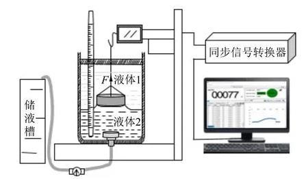 圖1為自制2種液體間界面張力的動態(tài)實時測量裝置圖,該儀器主要包括電腦顯示器、同步信號轉換器、自制實驗架臺、力敏傳感器、金屬吊環(huán)、恒溫杯、溫度計、排液孔、排液管、流速調節(jié)器和儲液槽等組成.