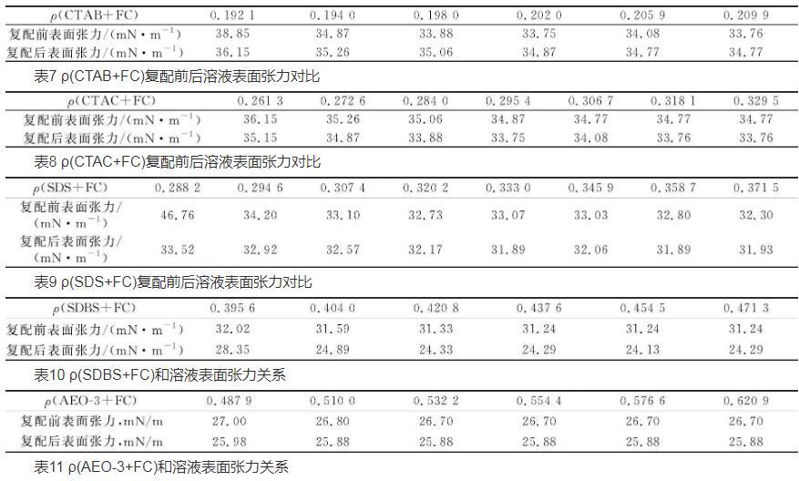 為了更好地提高表面活性劑的性能,降低表面活性劑的應(yīng)用成本,減輕其對環(huán)境的危害。在室溫下,分別測試不同濃度的碳?xì)浔砻婊钚詣┡cFC復(fù)配后表面張力的變化,實(shí)驗結(jié)果見表7~11。