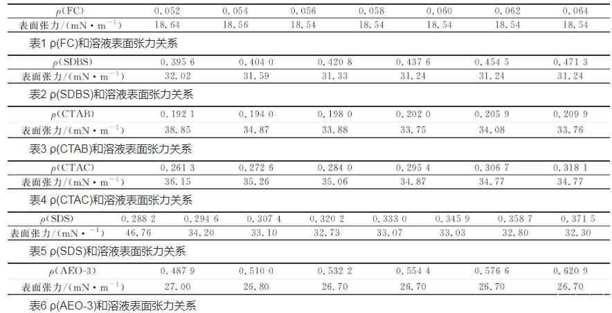 按照實(shí)驗方法Hz制備表面活性劑溶液,在室溫下,測定FC、CTAB、CTAC、SDS、SDBS和AEO-3表面活性劑的表面張力,確定CMC,結(jié)果見表1~6。