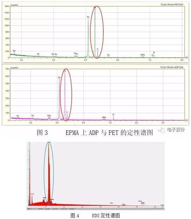結果顯示無論是EPMA-1720上的ADP晶體還是PET晶體,其分辨率都毫無疑問地能把S Ka(特征波長0.5373nm)和Pb Ma(特征波長0.5285nm)明顯的區(qū)分開來,呈現(xiàn)的是分開的兩個峰,見圖3中的紅色線內。而相同測試條件下的EDS譜圖中S Ka峰(特征能量2.308keV)已然不能使用軟件自動識別標出,手動添加的結果見圖4,其與Pb的Ma峰(特征能量2.343keV)重疊在一起,不能分開。