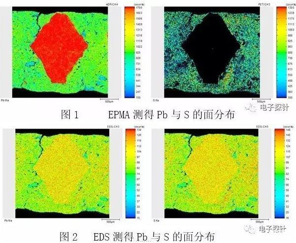 圖2為EDS測試結果,顯示Pb與S元素分布區(qū)域基本一致的現(xiàn)象,此為假象。這是由于兩個元素的主峰相互重疊,在能量上已不能被儀器區(qū)分開的緣故。